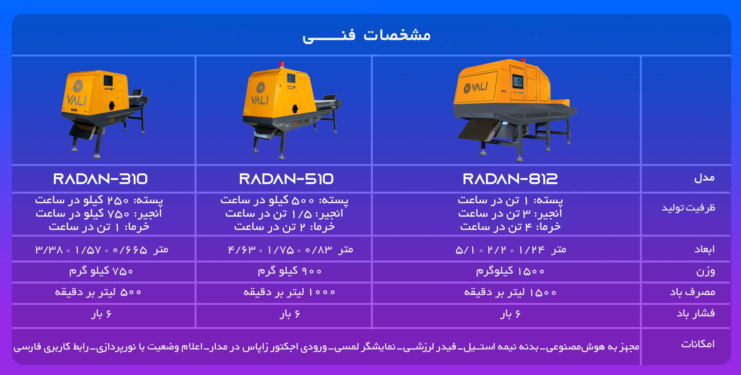 انواع محصولات کشاورزی از قبیل انجیر، خرما، پسته، حبوبات، زیتون، بادام، بنه، قهوه و گردو از نظر شکل و اندازه با سورترهای سری ردان قابل سورت هستند.