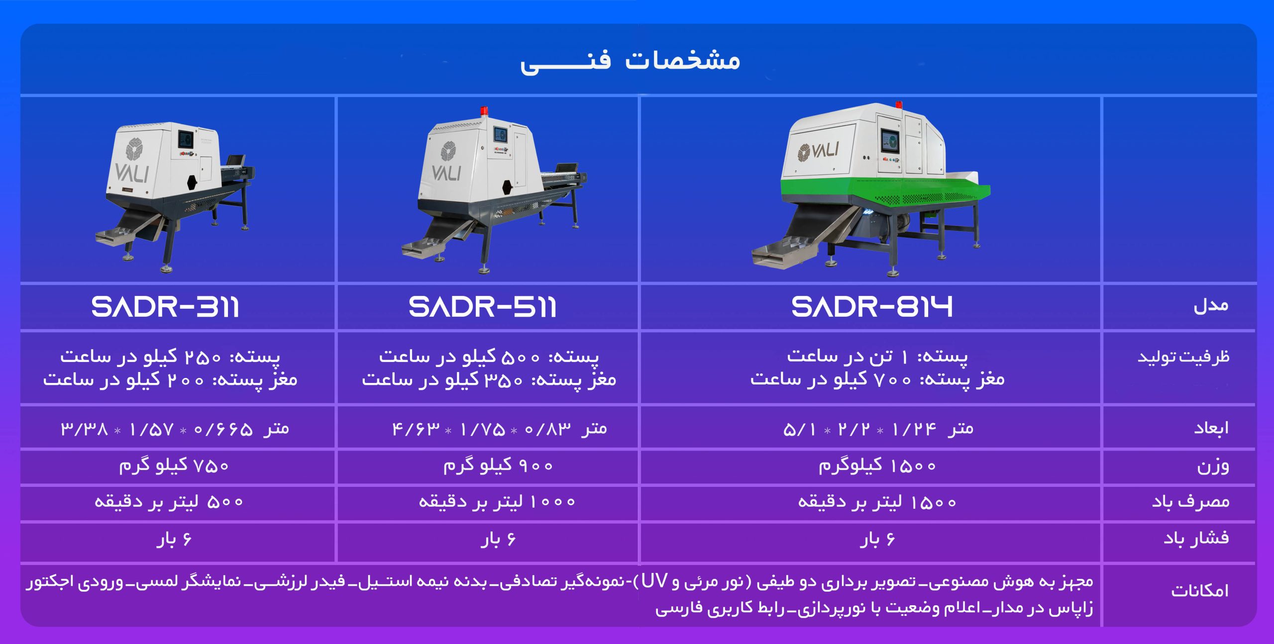 سورترهای صدر علاوه بر قابلیت سورت افلاتوکسین در پسته، قابلیت سورت انواع محصولات کشاورزی از قبیل انجیر، خرما، پسته، حبوبات، زیتون، بادام، بنه، قهوه و گردو از نظر شکل و اندازه را نیز دارا هستند.